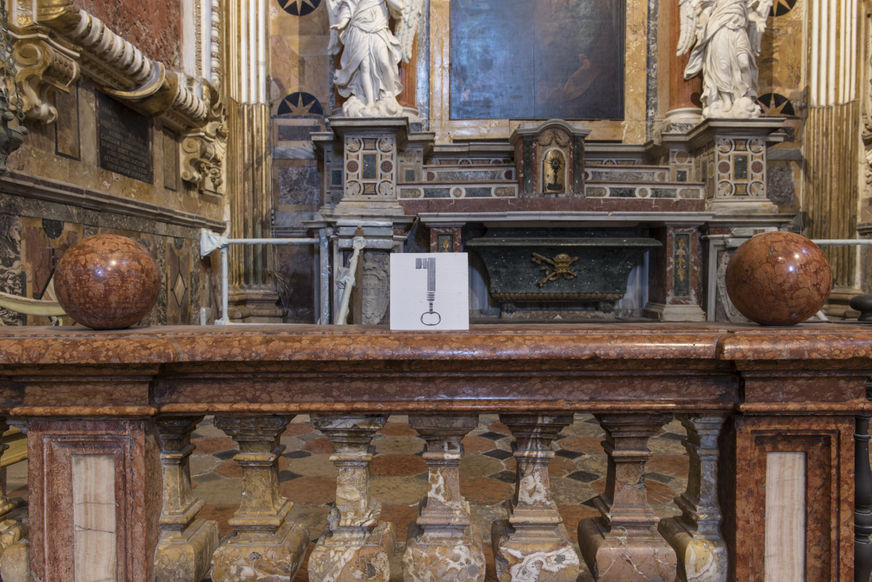La Cappella Maggiore è dedicata a San Pietro, notoriamente legato all’immagine delle chiavi. In questa sede il simbolo è presente nella pala dell’altare realizzata da Carlo Magini, una copia fedele dell’originale di Guido Reni, depredata dall’esercito napoleonico nel 1797, tutt’ora esposta al Museo del Louvre.